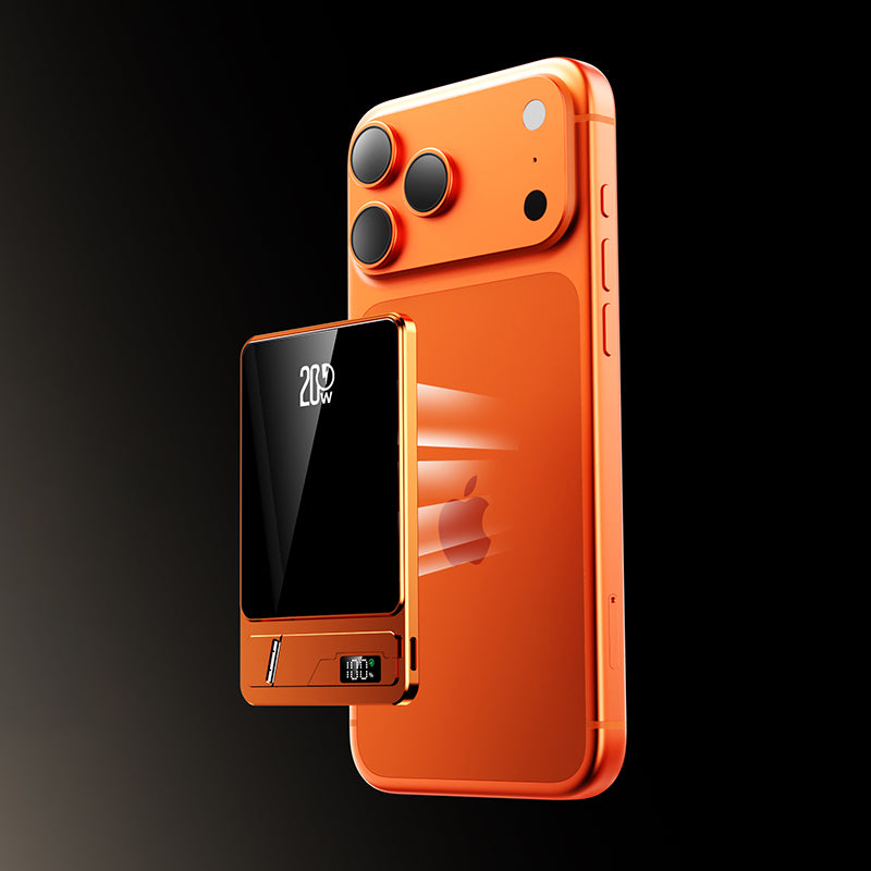 Ultra-thin magnetic power bank snaps securely to your device for wireless charging. Hidden stand deploys for hands-free viewing. Detachable lanyard hangs effortlessly for portable carry, combining slim design with everyday convenience.